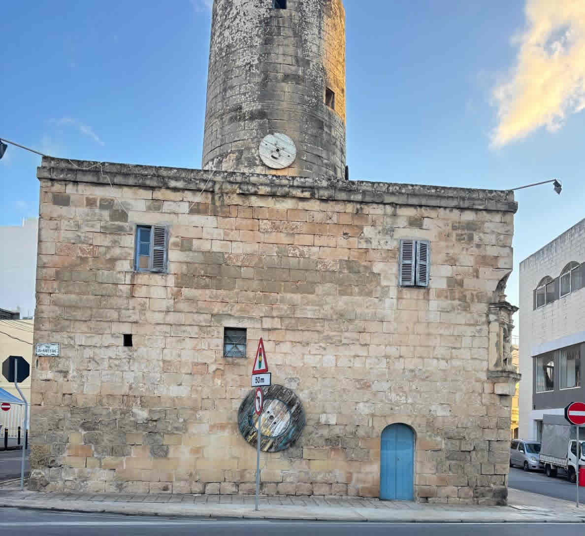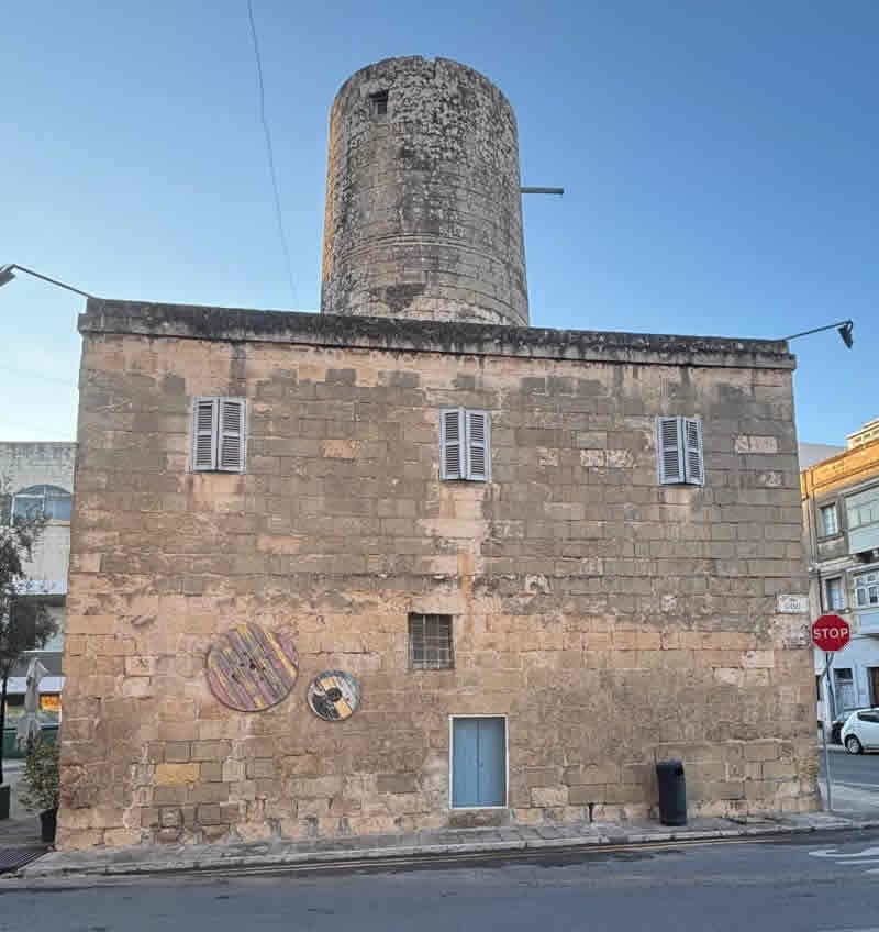 It is constructed in traditional limestone masonry, typical of windmills of the Knights period in Malta.