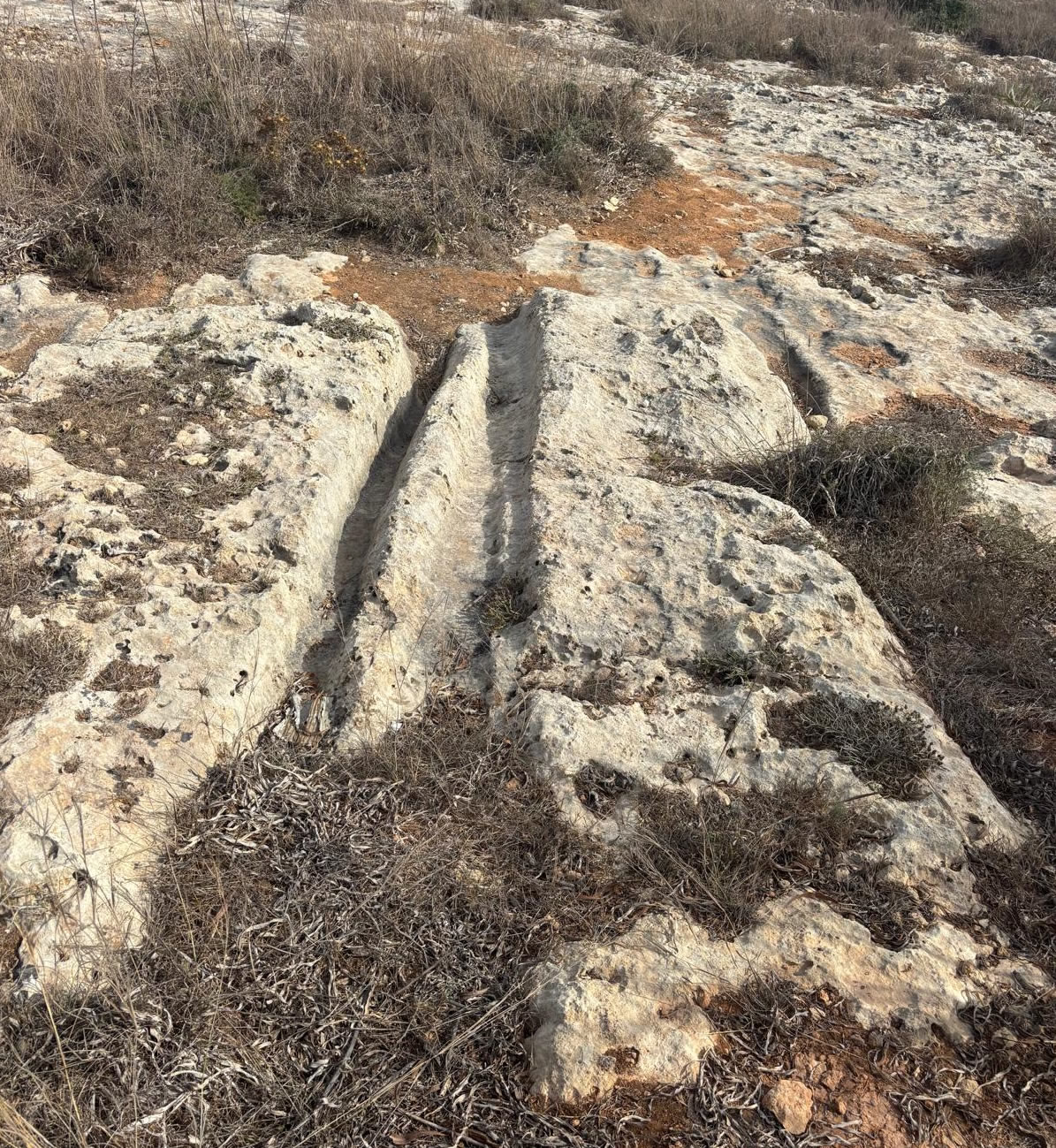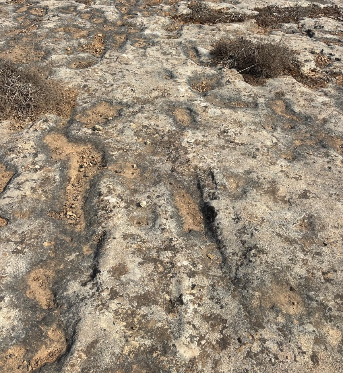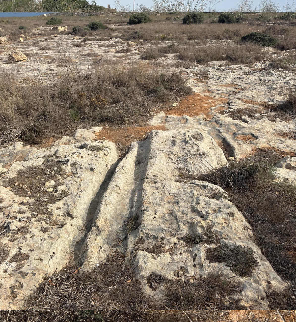 Cart ruts are parallel grooves cut into the limestone bedrock.